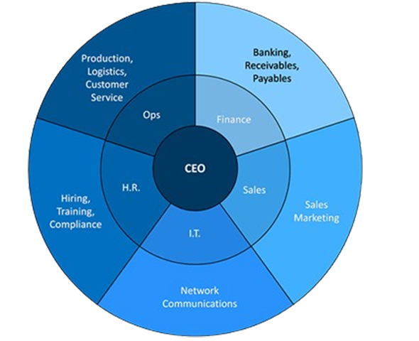 This represents a structured overview of an organization and the key departments working under the leadership of the CEO. Each segment highlights a major business function such as Operations, Finance, Sales, Marketing, IT, and Human Resources. Operations focuses on production, logistics, and customer service, while Finance manages banking, receivables, and payables. Sales and Marketing drive business growth, and IT ensures strong network communication and technical support. HR handles hiring, training, and compliance to maintain a productive workforce. Together, these interconnected departments collaborate to achieve organizational goals and ensure smooth, efficient, and strategic business operations.